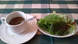 まず、野菜のスープとちょこっとグリーンサラダが出てきて